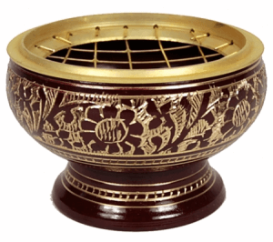 Kadidelnice v hnědé barvě, zdobená zlatými vzory. Velikost: 7,5 x 7,5 cm. Vyrobena je z mosazi a keramiky.